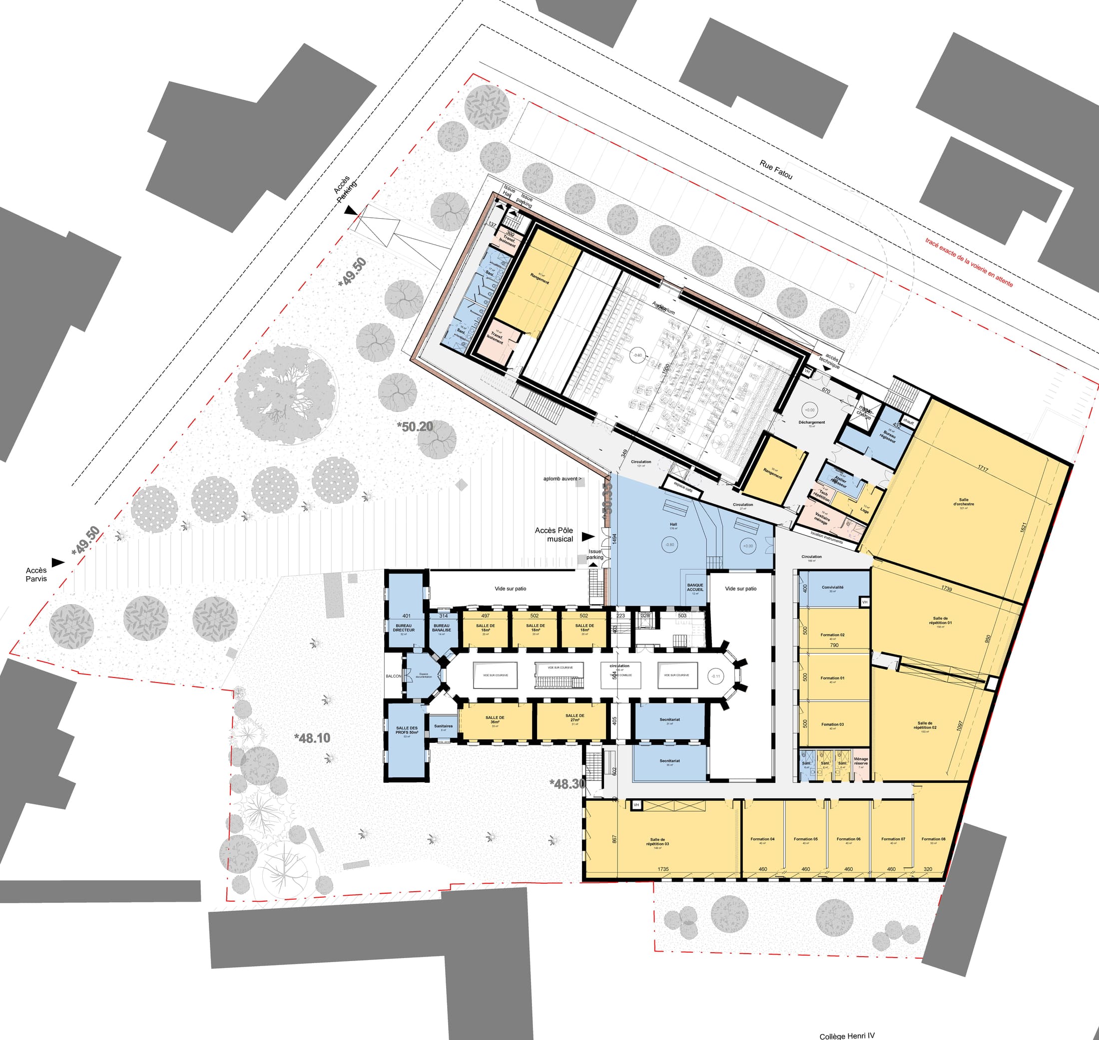 Building surface area: 4,500 m² / rehearsal rooms: 3×150 m²