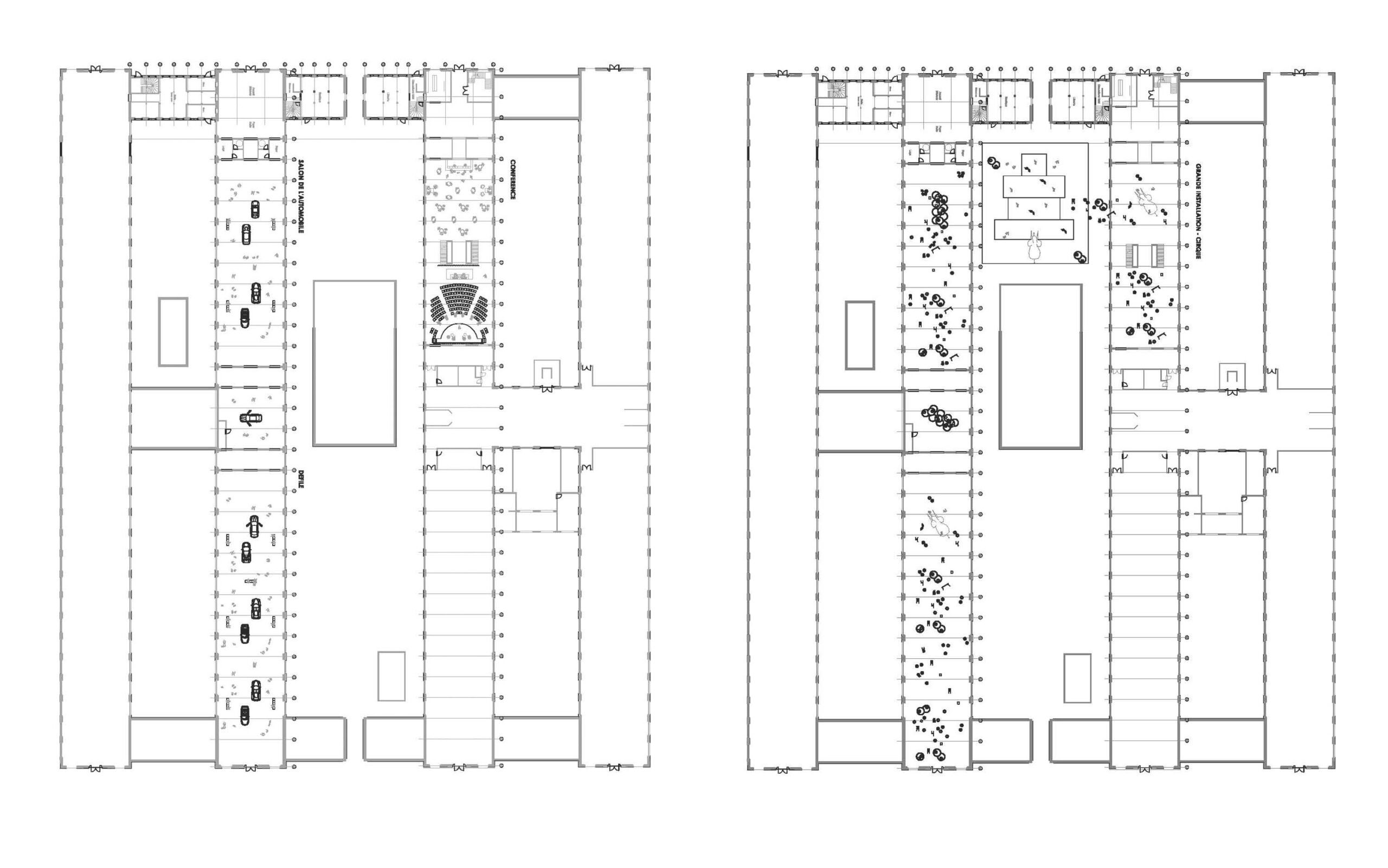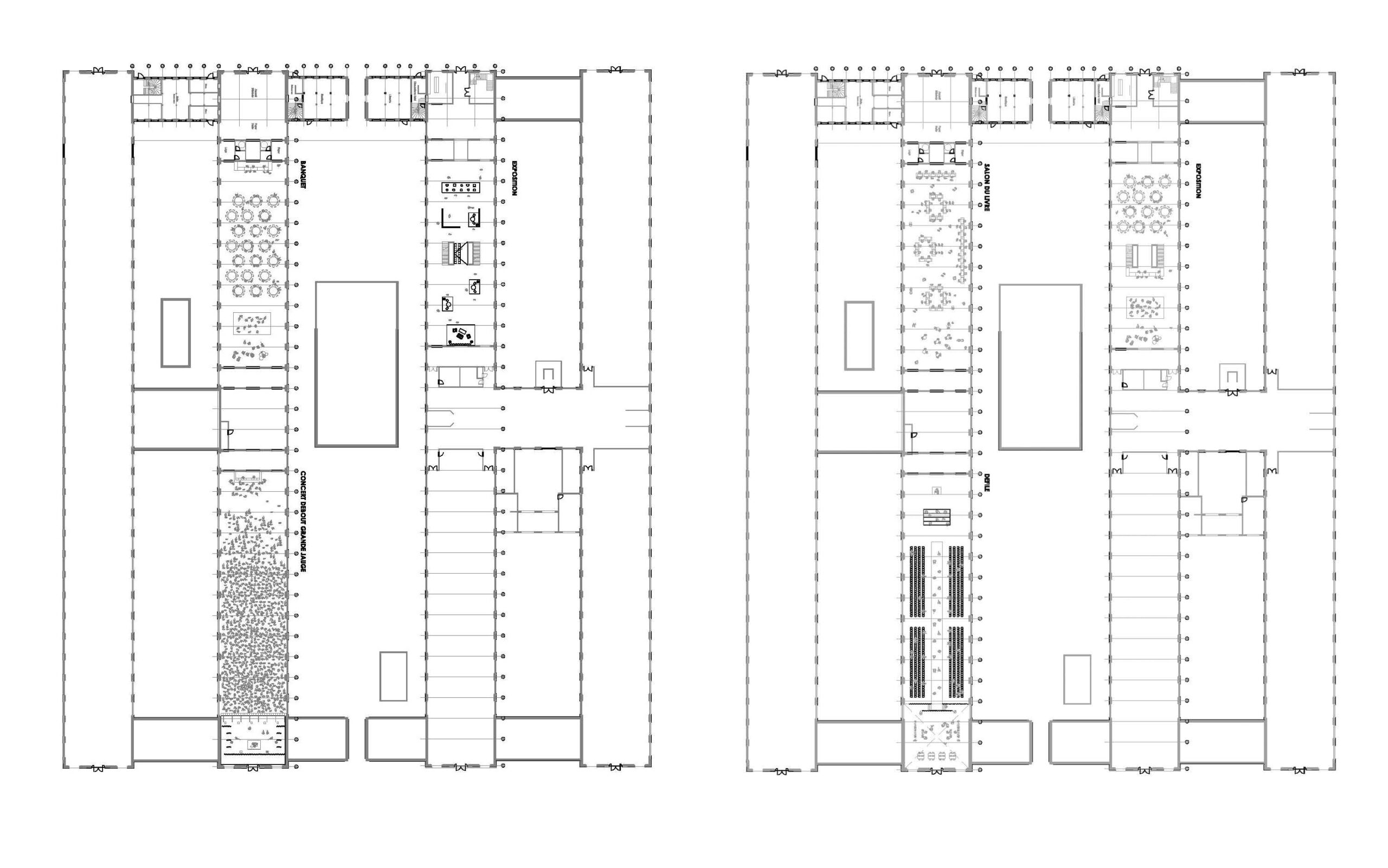 Part of the H buildings of the former Saint-Étienne arms factory has been converted into exhibition space and event rooms. Hall 242 has become the National Design Gallery, with its educational space and logistical facilities. It hosts semipermanent exhibitions from prestigious national collections. Covering an area of 700 m², the hall has been transformed into a “functional” space thanks to staging devices that are finely integrated into the existing architecture. This technical network allows staging and museography equipment to be suspended… Building 243 is divided into two event rooms with VIP areas, backstage areas, and a manufacturing workshop. They host a wide range of events: live shows, entertainment, circuses, conferences, exhibitions, etc. Our scenographic and technical choices transform the existing building into an agile, intelligent, and flexible scenographic machine. The existing framework becomes a stage grid “capable” of suspending various stage equipment. The entire system offers multiple spatial configurations.