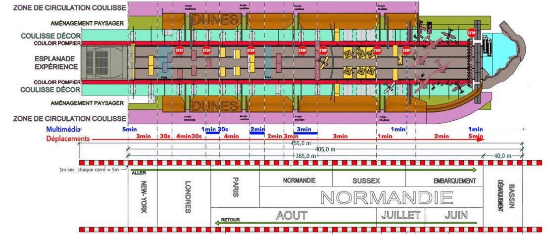 It’s almost like a real theater, with homogeneous visibility and places for people with reduced mobility, a stage and backstage area, a grill and lighting towers, control rooms… And all the openings needed for the actors and props to follow the movement, with doors in the distance that open to free up a 20 m wide, 10 m high stage frame, allowing the numerous historical tableaux to be crossed to and from the esplanade, installed on 48 motorized, 10 m high scenery carts.The optimization of space and budget means that no doors are closed to a script and staging that are still being written. The scenic concepts are defined on the basis of a show that must be able to repeat itself identically, 6 times a day, 6 to 7 days a week, with mobile elements, a hundred or so actors and at the mercy of the climate. The elements were therefore organized around a fixed, solid infrastructure, with the basic equipment required to meet the show’s expectations.