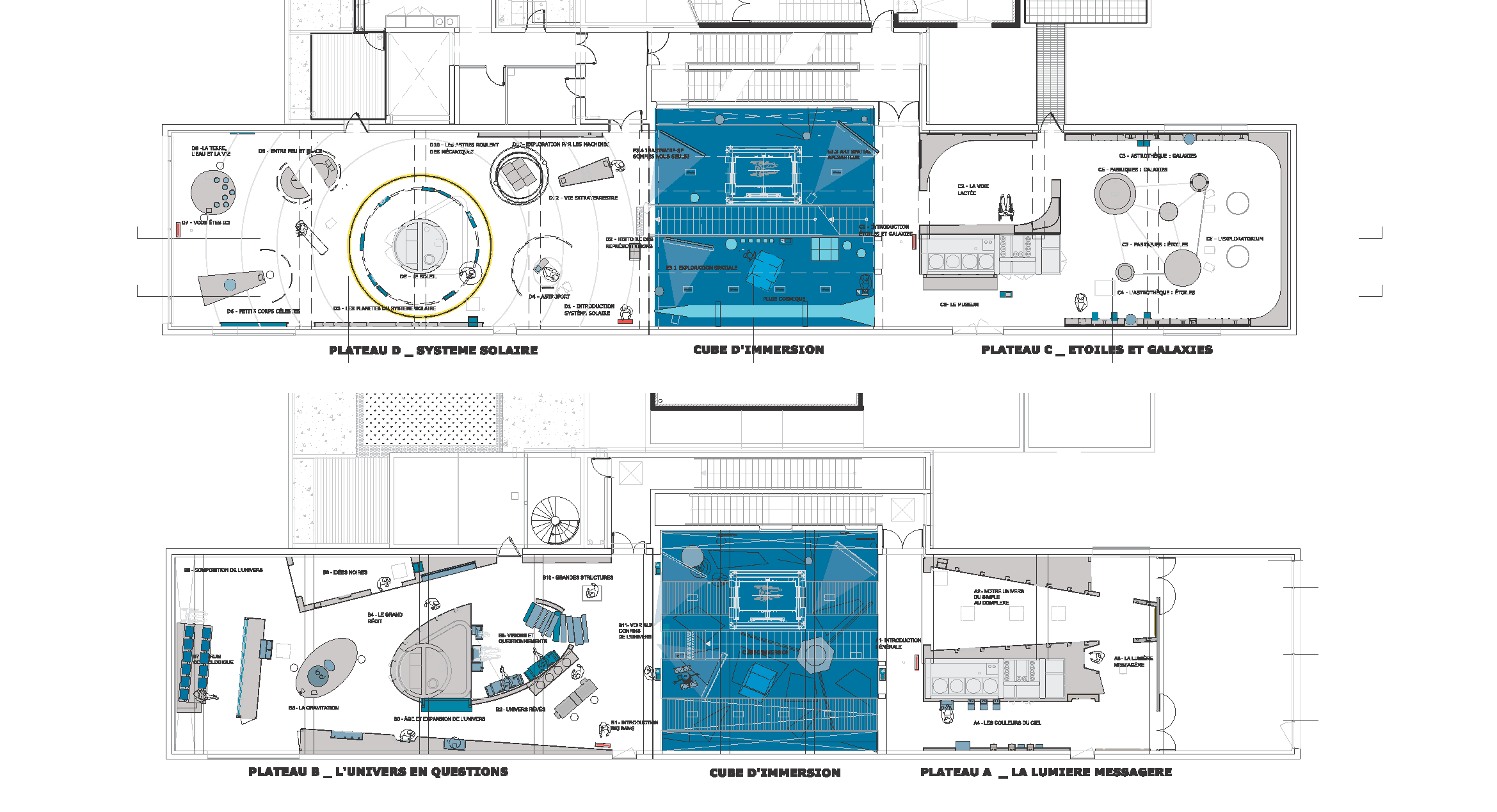 The permanent exhibition History of the universe, from the big bang to the grain of sand presents the major stages in the history of the universe in three thematic areas: the universe in question, the stars and galaxies, and the solar system, which are articulated around a “universe cube”; a space with blurred boundaries, dedicated to dreams and the imaginary, where the means invented and imagined by man to explore the cosmos are presented. A breath of fresh air, this cube acts as a link between the various themes. The overall composition alternates these sensory and immersive spaces with mediation trays featuring a wide variety of didactic devices (games, models, physical manipulations and optical theaters). It is this variety of messages and approaches – scientific, artistic, humanistic and poetic – that enables visitors, whether amateurs, scientists, novices or children, to better understand our universe and weave their own links between the different themes. The graphic vocabulary and illustrations, both artistic and scientific, give this exhibition a unique and highly aesthetic identity. Picto, hand-drawn illustration, characters, space-time grid