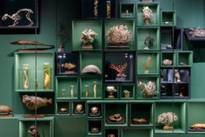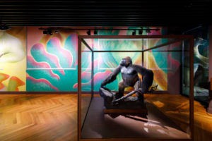 On the north facade of the building are seven permanent rooms, each dedicated to the museum’s iconic collections. Visitors learn more about a specimen and its species. Each Totem is presented in the center of the room, surrounded on two walls by immersive wallpaper designed for it, while the remaining walls display themes such as its ethology, geographical distribution, and representations in culture. The wolf, Asian elephant calf, gorilla, Nile crocodile, walrus, and elephant seal share one room, while the African coelacanth and the Blaschkas’ collection of glass models, the museum’s true gems, are displayed in another.