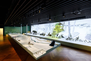 In the second-floor loop, visitors are invited to immerse themselves in a semi-permanent space dedicated to the Rhine and the local ecosystems of Alsace. A large immersive “cyclorama” explains these ecosystems and their inhabitants, accompanied by a large 18-meter-long educational table. A second room focuses on the human footprint on this river and the consequences of human activity on this biotope.
