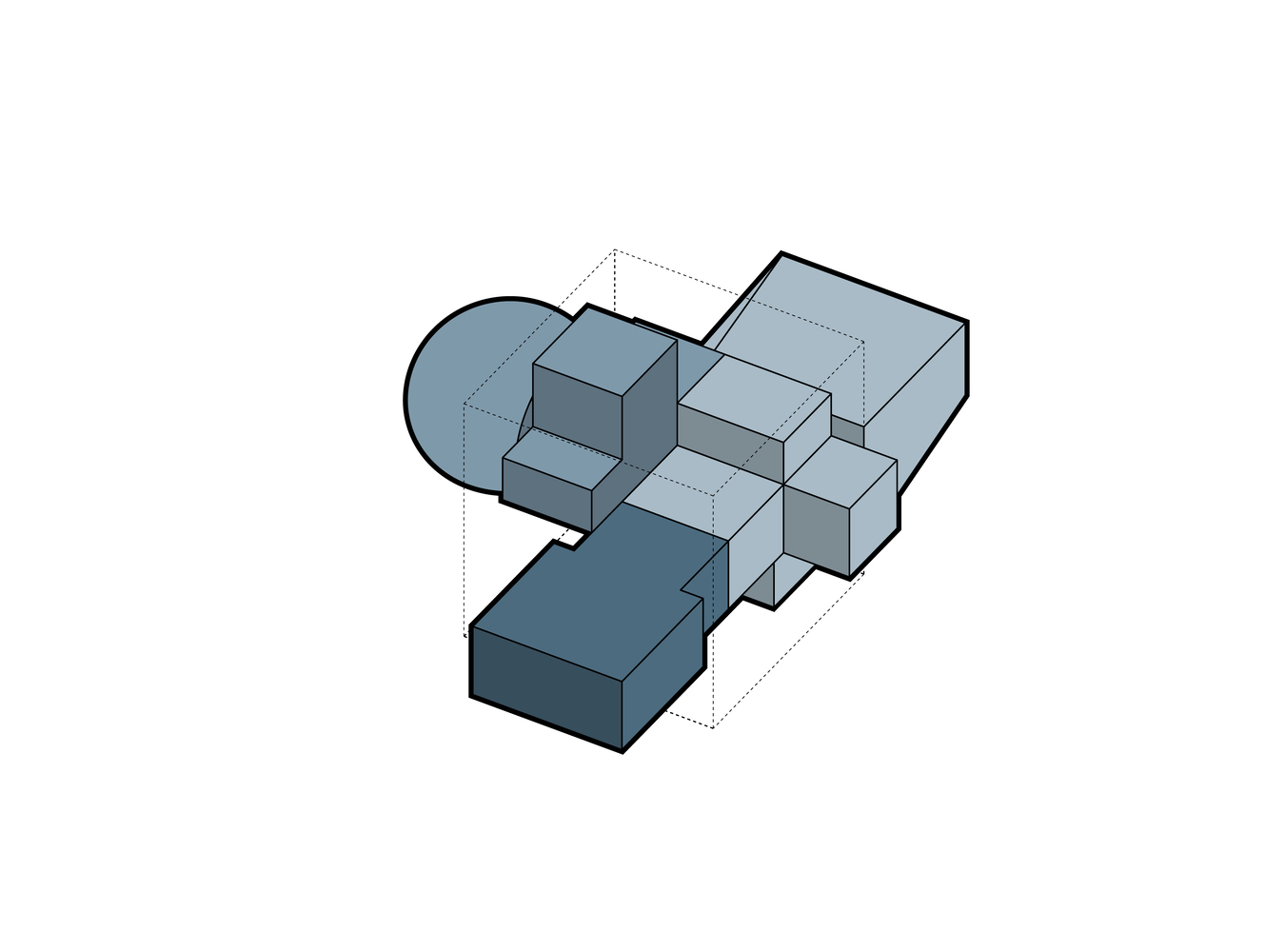 The building is in fact composed of a Globe Playhouse, a spherical theatre of 800 seats, a Grand Theatre of 1500 seats and a Blue Box of 800 seats. The three rooms are connected to a central cube. The cube accommodates the stages, back stages, and support spaces of the three theaters. The Grand Theatre and the Blue Box can then form only one Super Theatre, for unsuspected performances. The Globe Playhouse with a unique proscenium allows to experience the scenic framing in various forms.