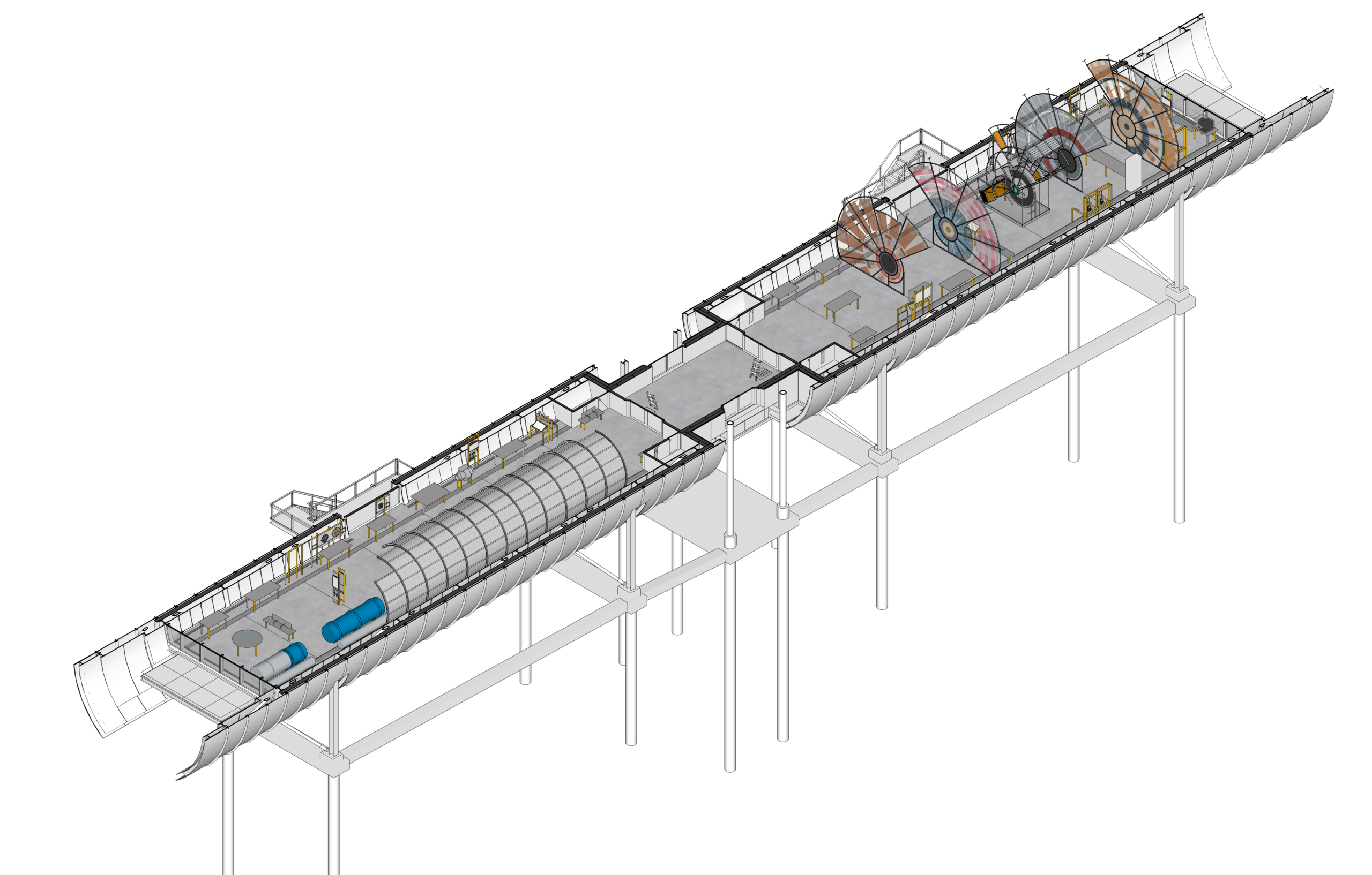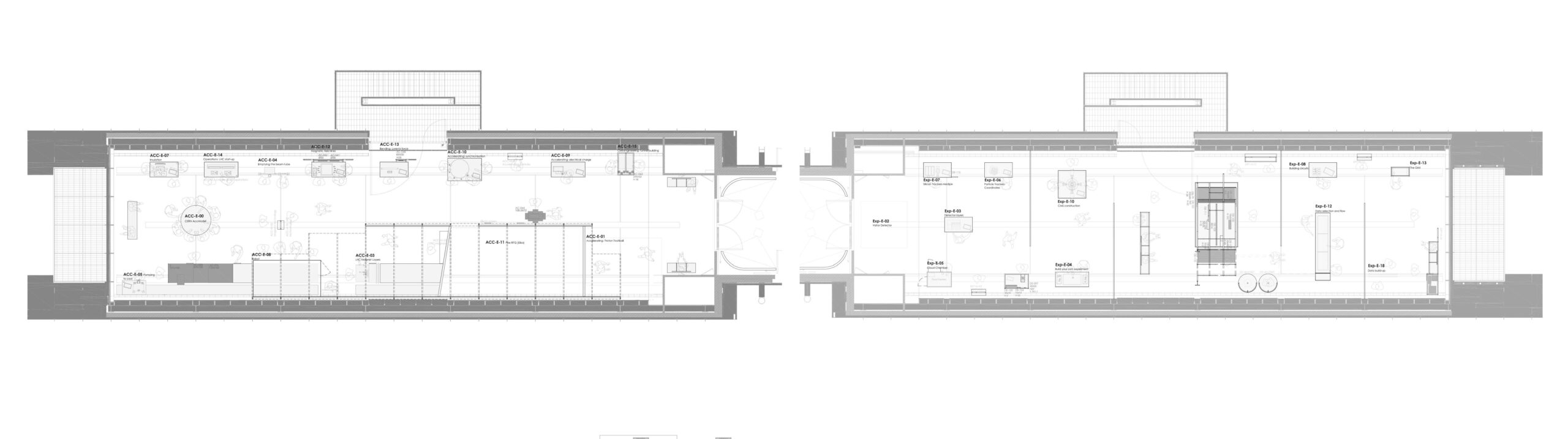 Le tunnel créé par l’architecture est un préalable à la scénographie, il offre déjà une certaine idée de l’immersion, il conduit et façonne la conception, la distribution et le parcours du visiteur. Une reconstitution à l’échelle 1 d’une partie du LHC trace un linéaire continu d’exploration dans l’espace. Toutes les expositions sont organisées en dialogue avec cette ligne et le tunnel. Le LHC est une entité animée autour de laquelle fourmillent public, médiation, objets, collections et animations.