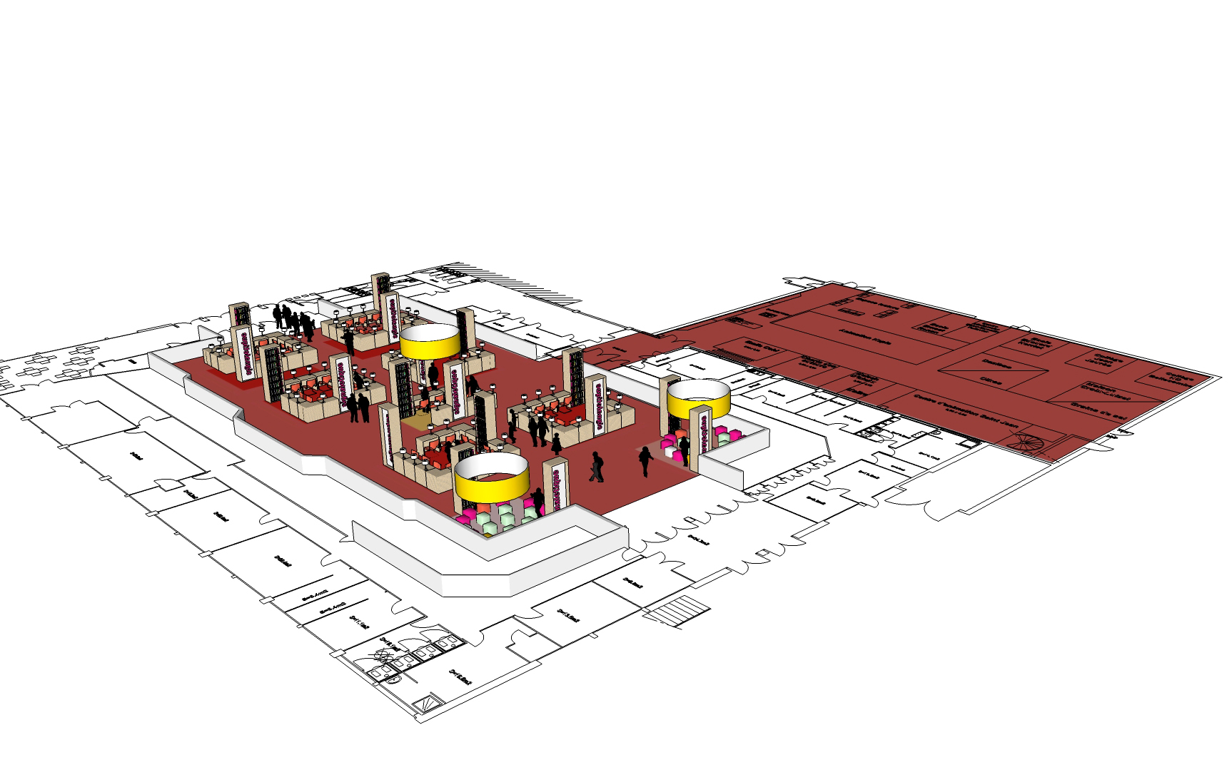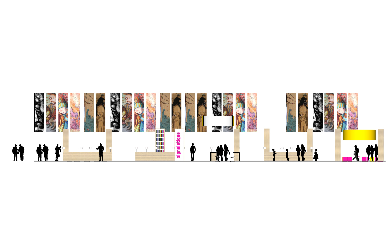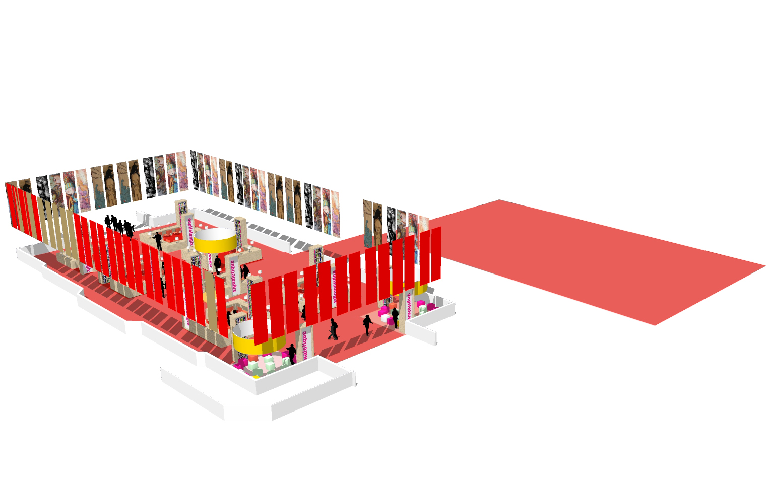 Conception scénographique du salon / conception des mobiliers des stands et bibliothèques / éclairage / aménagement et implantation des stands / conception des kiosques pour la 20e édition et canapé géant / conception des supports kakemonos