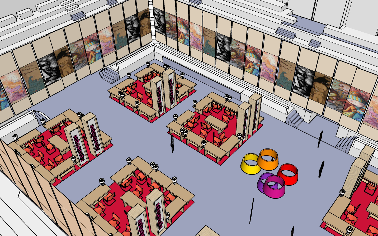 Le défi de la scénographie repose sur la transformation de la salle Raphaël-de-Barros (gymnase) en un espace accueillant et poétique reflétant l’identité de la Fête du Livre. Au coeur de cette métamorphose, le carton émerge comme le protagoniste incontournable, incarnant à la fois la chaleur, l’éco-responsabilité et la modularité.