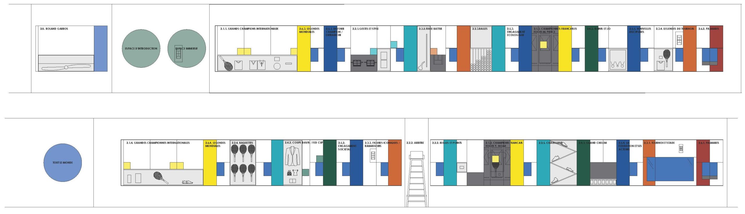 Dans le cadre de l’évolution du site de Roland Garros, la Fédération Française de Tennis souhaitait implanter un auditorium et une galerie muséale en lieu et place de l’ancien Tenniseum aujourd’hui utilisé comme lieu de stockage. Situés en sous-sol, les espaces du projet sont très contraints que se soit dans leurs formes ou leurs dimensions. L’auditorium est composé avec un gradin incurvé implanté sur une courbe de visibilité très optimisé pour offrir un confort homogène à chaque place malgré la hauteur limitée de l’espace. La scène accueille un grand écran led et l’ensemble des outils de pilotage et de connexions en liaison avec une généreuse régie pour répondre aux différents usages : projections, conférences, présentation de produits, petits concerts… Il est accompagné des espaces servants nécessaires (loges, locaux techniques, etc.), ainsi que d’un foyer, lui aussi équipé pour les grandes projections et toutes sortes d’événements. La galerie muséale met en perspective un match de tennis imaginaire entre Roland-Garros -le premier héros du site et l’inspirateur du défi sportif- et tous les joueurs de tennis -qu’ils soient professionnels ou amateurs, enfants, handicapés, etc.- Les différents thématiques se répondent comme dans un échange de balles entre les deux parois mêlant textes, écrans interactifs, manipulations ludiques, vestiaires de champions, projection anamorphosé et trésors de la collection et images des archives de la FFT. La bande son d’une séquence de match entérine l’atmosphère. Un espace introductif présente une projection immersive sur l’âme du site et un jeu de simulation permettant de tester son aptitude au retour gagnant face à un service de champion.