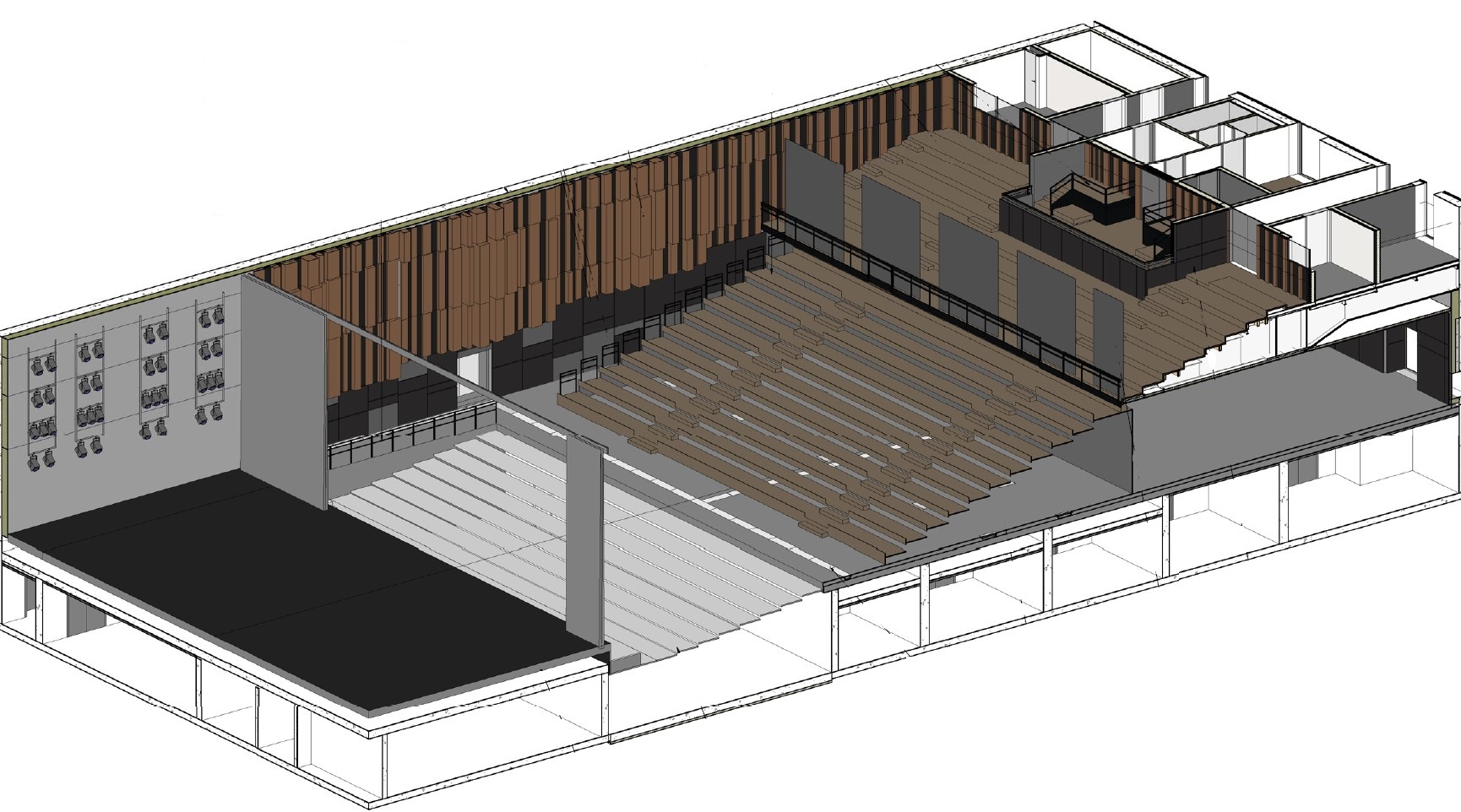 La Grande Salle polyvalente accueil l’Espace Léo Ferré dans une architecture hyper-flexible. Ses balcons frontaux hébergent la loge princière et la régie, occultables par des rideaux de jauge. Le parterre est modulable grâce à sa tribune télescopique et ses rangées de fauteuils retournables Gala©. Ces outils scéniques sont de véritables configurateurs de jauge. La scène motorisée est extensible et ajustable selon la position du public (assis/debout). Le plafond scénique profite d’un double réseau de passerelles, d’un gril praticable