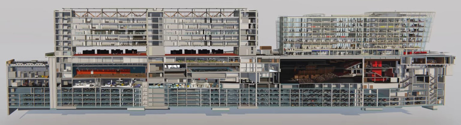 Sur près de 20 niveaux pour partie enterrés, ce projet multifonctionnel inclue une Grande salle polyvalente, un amphithéâtre scolaire et une médiathèque modulable… Et plus encore… puisqu’on y trouve un collège, une piscine, un gymnase, un tri postal, un centre de déchets, un data center et un parking de 900 pl.