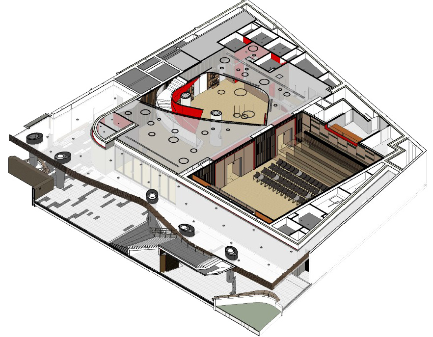 Projet urbain multifonction / espace culturel et salle polyvalente / collège avec amphithéâtre / médiathèque avec salle modulable / loges et backstage / accueil public et princier / logistique et stockage
