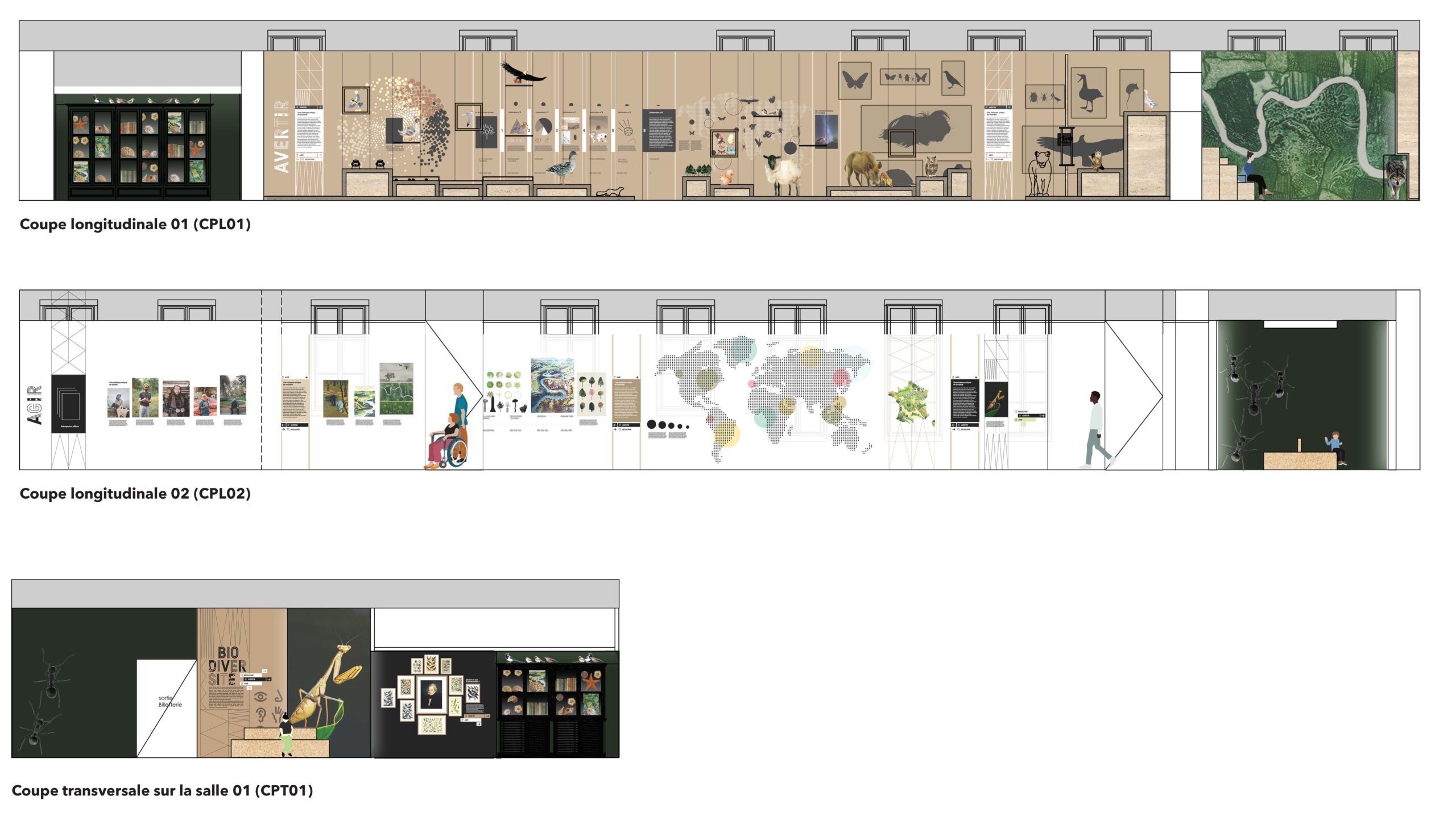 La forme étroite et linéaire des galeries et l’aller-retour inspirent une scénographie élargie qui tire parti du volume et de ses six faces pour agrandir l’espace et renforcer le sentiment d’immersion et de foisonnement. Les longs linéaires deviennent ainsi des fresques graphiques, supports continus de médiation, construisant un discours approfondi et réflexif à l’aller puis au retour. Les plafonds sont des toiles scénographiques, pour certaines animées, où les oiseaux volent, les nuages les animaux s’y installent, les miroirs démultiplient les effets et invitent à la contemplation.