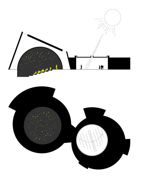 Le bâtiment qui s’inspire de la géométrie des observatoires et des instruments astronomiques se compose de deux ensembles. Le premier accueille les visiteurs -billetterie, boutique, cafétéria- et est le point d’entrée des activités culturelles et éducatives du Jardin des Sciences et des structures muséales de l’université -musée de zoologie, musée de minéralogie et de sismologie, jardin botanique, etc-. Le second soutient le dôme de 15 m de diamètre du planétarium, incliné à 18° et suspendu pour abaisser au maximum la ligne d’horizon et renforcer l’immersion des spectateurs. Il peut accueillir 138 personnes, confortablement installées dans des fauteuils dont les différentes inclinaisons offrent une visibilité maximale et homogène sur les 30 millions de pixels du système de projections composé de 6 vidéoprojecteurs. Un dispositif de diffusion spatialisée du son complète le dispositif immersif. Il est possible de redresser les fauteuils et de constituer une petite scène -en démontant le premier rang- pour accueillir de petites formes de spectacles -lecture, musique de chambre-.