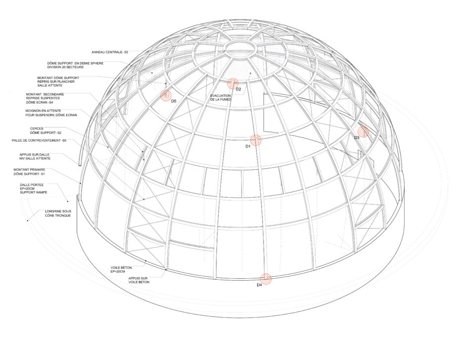 Nous avons assuré le conseil sur les questions scénographiques globales -accès, flux, réseaux, attente et entrée des visiteurs, etc.- et plus particulièrement les études de visibilités et d’implantation des assises. Nous avons étudié un dispositif dynamique comme objet signalétique sur la toiture qui n’a pas été finalement retenu.