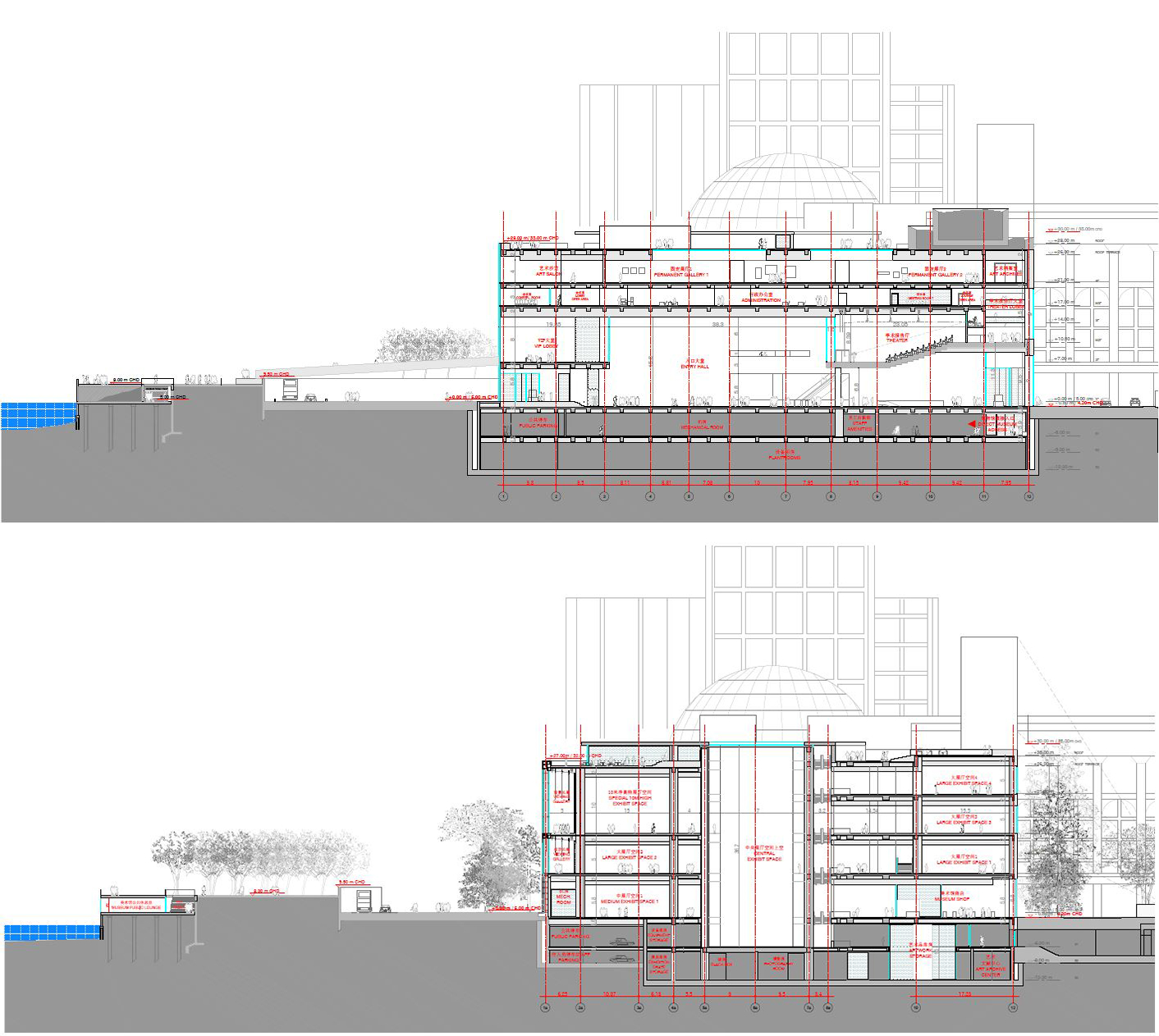 Construction d’un musée d’art moderne sur les rives du fleuve Huangpu / galeries d’exposition temporaire / auditorium