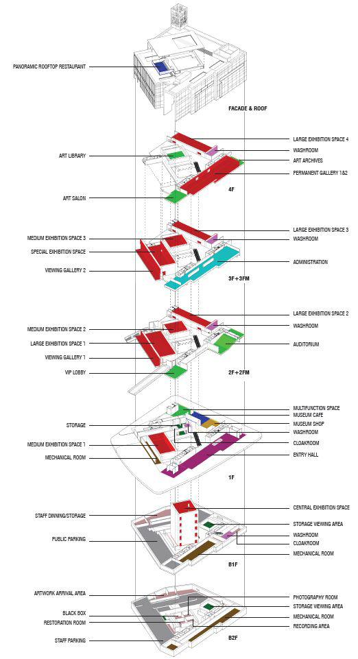 L’innovation architecturale autour du partage de l’Art avec des galeries géantes ouvertes vers l’extérieur pour que tout le monde puisse en profiter. La scénographie est donc restée dans ses valeurs, avec des espaces directement ouverts au public. Un lobby pouvant se transformer en lieu d’exposition, une galerie centrale permettant au public de cheminer au plus près des oeuvres d’art. Des galeries qui se découpent, qui se complètent et qui offrent des configurations infinies. Une salle de spectacle modulable pour poser, discuter et proposer les tendances artistiques de demain.