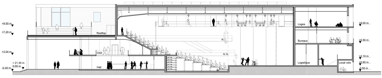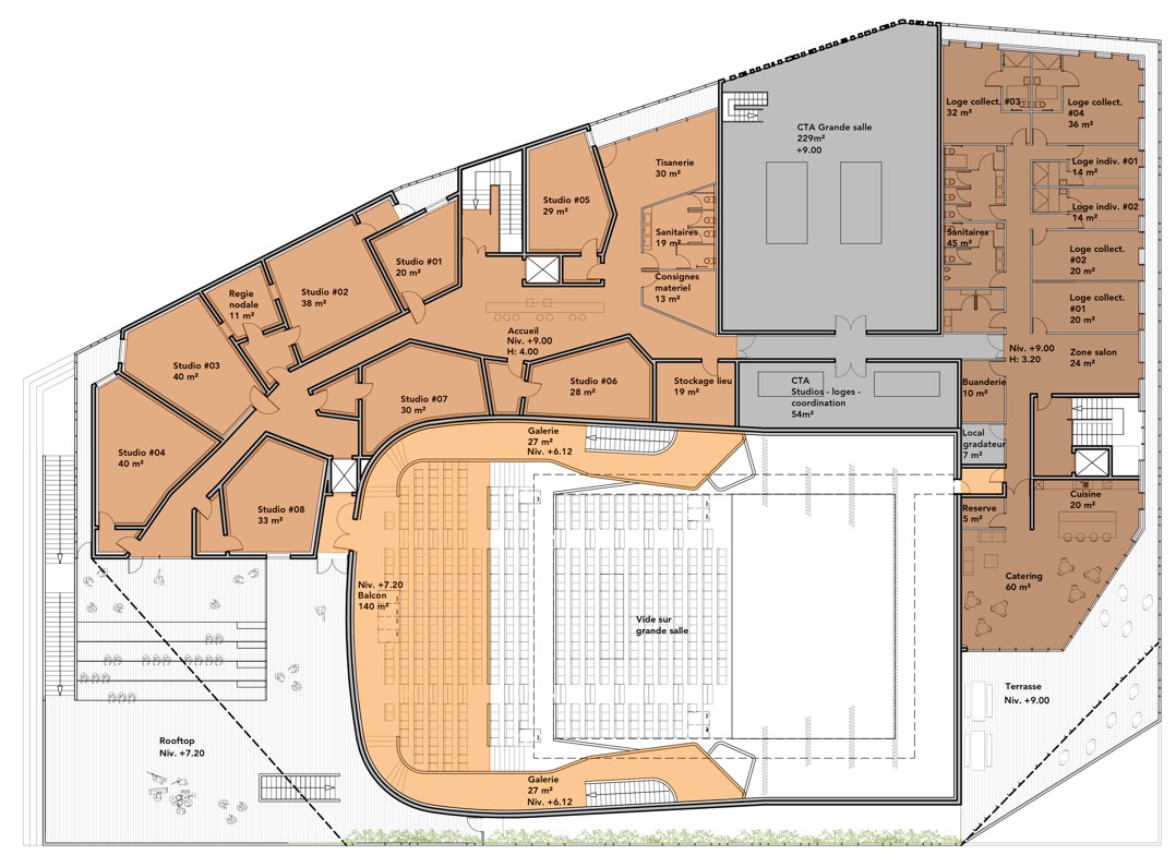 Les inflexions du site ont guidé le travail sur l’organisation des différents niveaux du projet. Du côté de la logistique, depuis la cour technique couverte, un quai de déchargement « à cul de camion » et un espace de jonction commun permettent de desservir de plain-pied l’arrière-scène et ses différents locaux techniques dédiés et les deux scènes. Du côté des spectateurs, l’accès est direct depuis la cote médiane du site et la grande terrasse, qui donne de plain-pied sur les deux halls et les parterres des deux salles.